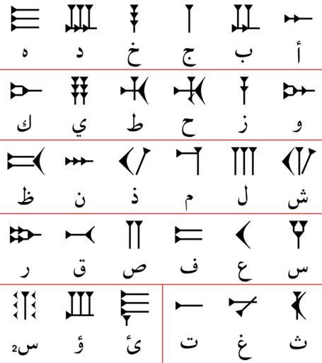 | Keywords: Ugaritic-alphabet-chart-Arabic.svg أبجدية أوغاريتية A table of the letters of the ancient Ugaritic cuneiform alphabet; under each Ugaritic letter is the letter of the Arabic alphabet which most closely corresponds to it The rows read from right to left Note that the modern pronunciation of the Arabic letter is not always exactly the same as the probable ancient pronunciation of the Ugaritic letter particularly in the case of Ugaritic g and Arabic <big>ج</big> only valid in Egyptian dialect and Ugaritic p and Arabic <big>ف</big> Also it is not known exactly how the Ugaritic emphatic sounds ṭ ṣ ẓ q ط ص ظ ق were distinguished in pronunciation from the corresponding non-emphatic sounds t s θ k ت س ث ك and the phonetic basis of emphasis contrasts in ancient Ugaritic could have been different from the phonetic basis of emphasis contrasts in modern Arabic The vertical red line in the last row of the table divides the basic 27 Ugaritic letters presumably adapted from an early non-Cuneiform alphabet from the last three letters which seem to have been added within Ugaritic originally to transcribe foreign words or languages The only punctuation was a word divider a short vertical stroke not shown in the table This is a self-made graphic based on fonts and publicly-available information declared to be in the public domain Ugaritic-alphabet-chart svg 2012-03 AnonMoos For a version of this table with Latin-alphabet transcriptions see File Ugaritic-alphabet-chart svg For a chart with somewhat different letter-shapes since based on a more tapering wedge and including the word-divider see File Ugaritic script sample svg 350px center Ugaritic letters Alphabet charts Tables with Arabic script typeset in SVG |