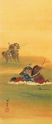 | Keywords: Ujigawa,Kajiwara Kagesue&Sasaki Takatsuna.jpg ja 宇治 の先陣争いで梶原景季を虚 で追い越した佐 高綱が 底に張られた太綱を切り払いながら対岸に向かう場 宇治 先陣争図 高 市歴史資料館蔵 大塚春嶺 明治時代 PD-Art Battle of Uji 1184 Rivers in ukiyo-e Cavalry of Japan Historic samurai prints Sasaki Takatsuna Kajiwara Kagesue |