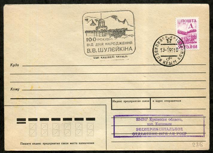 Keywords: Ukraine stamps 005 05003.jpg en A cover of Ukraine with a special stamp a centenary of V V Shuleikin Katsiveli Crimea cancelled January 13 1995 ru Конве т Ук аины со спецгашением 100-летие со дня ождения В В Шулейкина Кацивели К ым 13 01 1995 Own collection Anizotropia 1995 PD-Ukraine Postmarks of Yalta Covers of Ukraine 1995 Postmarks of Ukraine 1995 |