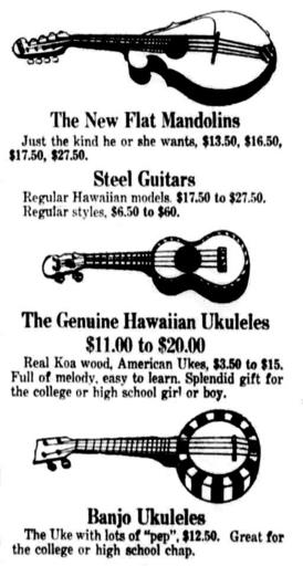 | Keywords: Ukulele, Mandolins, Banjos.jpg en George E K Awai and his Royal Hawaiian Quartet popularized the small guitar-like instrument when they performed at the Panama Pacific International Exposition at San Francisco in 1915 From then on to the early 1920s the ukulele became popular on the mainland United States Flat mandolins ukuleles and banjo ukuleles From an ad by J W Jenkins Sons ™ Music Co Ukulele Mandolin Banjo Oklahoma City times Dec 16 1918 Page 6 http //chroniclingamerica loc gov/lccn/sn86064187/1918-12-16/ed-1/seq-6/ 1918-12-16 Chronicling America - http //chroniclingamerica loc gov/ Hawaii Digital Newspaper Project - https //hdnpblog wordpress com/ unknown other versions PD-old-70-1923 Newspaper advertising Ukulele Mandolin advertisements Portuguese guitar Koa wood instruments Hawaiian music Banjos 1910s String instruments Guitar family instruments Music stores 1918 |