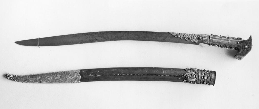 | Keywords: Umar - Sword ("Yataghan") and Scabbard - Walters 516.jpg Of the various types of Islamic arms the sword or saber and dagger were the most prized by European and American collectors including Henry Walters These works were admired for their diverse shapes and materials and especially for their rich and intricate surface decoration between 1810 1811 Modern steel inlaid with silver blade ; gilded silver with filigree coral and enamel insets hilt ; gilded silver filigree coral and leather scabbard cm 8 4 75 3 10 accession number 51 6 22321 Henry Walters Baltimore date and mode of acquisition unknown Walters Art Museum Henry Walters Acquired by Henry Walters Signature Inscribed on inlaid silver Work of Umar Sahib Agha 1225 place of origin Turkey Walters Art Museum license Weapons in the Walters Art Museum Islamic metalwork in the Walters Art Museum Scabbards Swords of the 19th century Yatagans |