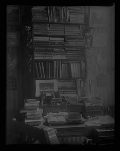 | Keywords: Un cabinet de travail - 51Fi149 - Fonds Trutat.jpg Artwork Creator Eugène Trutat Entre 1858 et 1907 Vue d'ensemble d'un cabinet de travail Au premier plan bureau tiroirs sur le plan de travail cahier ouvert photographies ; sur les étagères nombreux albums chevalet cadres photos ; au mur étagères de livre bibelots ; au second plan peintures et tapisseries au mur between 1858 1907 photograph glass cm 12 9 Institution Archives municipales de Toulouse object history ProvenanceEvent 1971 gift Association des Toulousains de Toulouse Jean Trutat ProvenanceEvent 2006-12-14 deposited Archives municipales de Toulouse Association des Toulousains de Toulouse credit line 51Fi149 Fonds Eugène Trutat - Archives municipales de Toulouse PD-old-100 Photographs by Eugène Trutat Fonds Trutat - Archives municipales de Toulouse 51Fi149 Desks in France Cluttered bookshelves Black and white photographs |