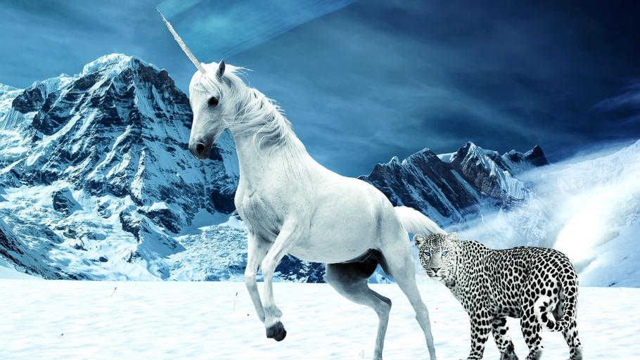 Keywords: unicorn mythical creatures magic landscape mystical fantasy fairy tales mountains leopard winter snow atmosphere cold animals horse compilation collage assembly wild blizzard panorama white blue color mythical photo montage