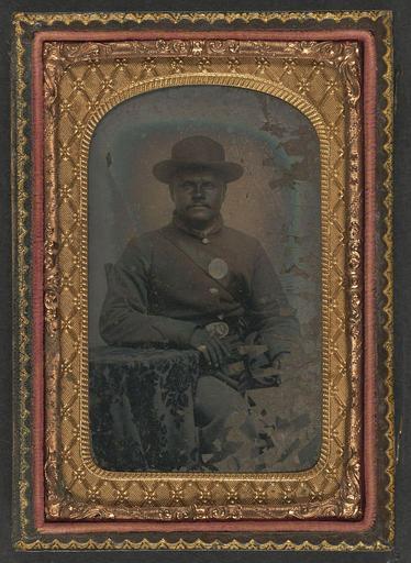 Keywords: library of congress libraryofcongress dc:identifier=http://hdl.loc.gov/loc.pnp/ppmsca.27414 dc:identifier=httphdllocgovlocpnpppmsca27414 xmlns:dc=http://purl.org/dc/elements/1.1/ xmlns:dc=httppurlorgdcelements11 u.s. civil war uscivilwar american civil war americancivilwar the civil war thecivilwar civil war civilwar war between the states warbetweenthestates united states of america unitedstatesofamerica u.s.a. usa the union theunion union the north thenorth yankee yankees soldier african american africanamerican picture frame people ancient photo border [Unidentified African American soldier in Union uniform] [between 1861 and 1865] 1 photograph : carte de visite-plate tintype, hand-colored ; 10.5 x 7.8 cm (case) Notes: Title devised by Library staff. Case: Leather ornate geometric gem. Gift; Tom Liljenquist; 2010; (DLC/PP-2010:105). Subjects: United States.--Army.--People--1860-1870. African Americans--Military service--1860-1870. Soldiers--Union--1860-1870. Military uniforms--Union--1860-1870. United States--History--Civil War, 1861-1865--Military personnel--Union. Format: Portrait photographs--1860-1870. Tintypes--Hand-colored--1860-1870. Rights Info: No known restrictions on publication. Repository: Library of Congress, Prints and Photographs Division, Washington, D.C. 20540 USA, hdl.loc.gov/loc.pnp/pp.print Part Of: Ambrotype/Tintype filing series (Library of Congress) (DLC) 2010650518 Liljenquist Family collection (Library of Congress) (DLC) 2010650519 More information about this collection is available at hdl.loc.gov/loc.pnp/pp.lilj Persistent URL: hdl.loc.gov/loc.pnp/ppmsca.27414 Call Number: AMB/TIN no. 2549 [Unidentified African American soldier in Union uniform] [between 1861 and 1865] 1 photograph : carte de visite-plate tintype, hand-colored ; 10.5 x 7.8 cm (case) Notes: Title devised by Library staff. Case: Leather ornate geometric gem. Gift; Tom Liljenquist; 2010; (DLC/PP-2010:105). Subjects: United States.--Army.--People--1860-1870. African Americans--Military service--1860-1870. Soldiers--Union--1860-1870. Military uniforms--Union--1860-1870. United States--History--Civil War, 1861-1865--Military personnel--Union. Format: Portrait photographs--1860-1870. Tintypes--Hand-colored--1860-1870. Rights Info: No known restrictions on publication. Repository: Library of Congress, Prints and Photographs Division, Washington, D.C. 20540 USA, hdl.loc.gov/loc.pnp/pp.print Part Of: Ambrotype/Tintype filing series (Library of Congress) (DLC) 2010650518 Liljenquist Family collection (Library of Congress) (DLC) 2010650519 More information about this collection is available at hdl.loc.gov/loc.pnp/pp.lilj Persistent URL: hdl.loc.gov/loc.pnp/ppmsca.27414 Call Number: AMB/TIN no. 2549 |
