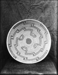 Photograph of an unidentified Indian basket on display, photographed ca.1900. It is displayed leaning against a dark cloth. The large flat platter-shaped basket has is woven spirally and has a stepped pattern in its design.