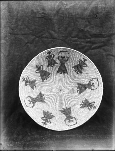 Photograph of an unidentified Indian basket on display, photographed ca.1900. It is displayed against a dark cloth. It is round and flat. It is spiral woven from the center out. It has patterns of the figures of women woven into the design.
