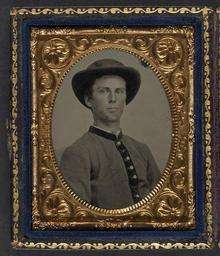 Keywords: library of congress libraryofcongress dc:identifier=http://hdl.loc.gov/loc.pnp/ppmsca.27149 dc:identifier=httphdllocgovlocpnpppmsca27149 xmlns:dc=http://purl.org/dc/elements/1.1/ xmlns:dc=httppurlorgdcelements11 picture frame people photo border [Unidentified soldier in Confederate uniform and slouch hat] [between 1861 and 1865] 1 photograph : ninth-plate tintype, hand-colored ; 7.5 x 6.3 cm (case) Notes: Title devised by Library staff. Case: Rinhart, no. 154. Photograph shows uniform is missing coat buttons. Gift; Tom Liljenquist; 2010; (DLC/PP-2010:105). Purchased from: War Between the States Memorabilia, Gettysburg, Pennsylvania, 2002. Subjects: Confederate States of America.--Army--People--1860-1870. Soldiers--Confederate--1860-1870. Military uniforms--Confederate--1860-1870. United States--History--Civil War, 1861-1865--Military personnel--Confederate. Format: Portrait photographs--1860-1870. Tintypes--Hand-colored--1860-1870. Rights Info: No known restrictions on publication. Repository: Library of Congress, Prints and Photographs Division, Washington, D.C. 20540 USA, hdl.loc.gov/loc.pnp/pp.print Part Of: Ambrotype/Tintype filing series (Library of Congress) (DLC) 2010650518 Liljenquist Family collection (Library of Congress) (DLC) 2010650519 More information about this collection is available at hdl.loc.gov/loc.pnp/pp.lilj Persistent URL: hdl.loc.gov/loc.pnp/ppmsca.27149 Call Number: AMB/TIN no. 2296 [Unidentified soldier in Confederate uniform and slouch hat] [between 1861 and 1865] 1 photograph : ninth-plate tintype, hand-colored ; 7.5 x 6.3 cm (case) Notes: Title devised by Library staff. Case: Rinhart, no. 154. Photograph shows uniform is missing coat buttons. Gift; Tom Liljenquist; 2010; (DLC/PP-2010:105). Purchased from: War Between the States Memorabilia, Gettysburg, Pennsylvania, 2002. Subjects: Confederate States of America.--Army--People--1860-1870. Soldiers--Confederate--1860-1870. Military uniforms--Confederate--1860-1870. United States--History--Civil War, 1861-1865--Military personnel--Confederate. Format: Portrait photographs--1860-1870. Tintypes--Hand-colored--1860-1870. Rights Info: No known restrictions on publication. Repository: Library of Congress, Prints and Photographs Division, Washington, D.C. 20540 USA, hdl.loc.gov/loc.pnp/pp.print Part Of: Ambrotype/Tintype filing series (Library of Congress) (DLC) 2010650518 Liljenquist Family collection (Library of Congress) (DLC) 2010650519 More information about this collection is available at hdl.loc.gov/loc.pnp/pp.lilj Persistent URL: hdl.loc.gov/loc.pnp/ppmsca.27149 Call Number: AMB/TIN no. 2296 |