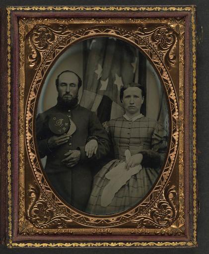 Keywords: library of congress libraryofcongress dc:identifier=http://hdl.loc.gov/loc.pnp/ppmsca.26935 dc:identifier=httphdllocgovlocpnpppmsca26935 xmlns:dc=http://purl.org/dc/elements/1.1/ xmlns:dc=httppurlorgdcelements11 civil war civilwar us civil war uscivilwar united states unitedstates soldier american american civil war americancivilwar uniform military 12th new hampshire infantry 12thnewhampshireinfantry infantry groupshot people photo border picture frame [Unidentified soldier in Union frock coat holding Company G, 12th New Hampshire Infantry Regiment forage cap next to unidentified woman in front of an American flag] [between 1861 and 1865] 1 photograph : quater-plate ambrotype, hand-colored ; 11.8 x 9.4 cm (case) Notes: Title devised by Library staff. Case: Leather floral scroll motif. Gift; Tom Liljenquist; 2010; (DLC/PP-2010:105). Purchased from: The Union Drummer Boy, Gettysburg, Pennsylvania, 2002. Subjects: United States.--Army--New Hampshire Infantry Regiment, 11th (1862-1865)--People--1860-1870. Soldiers--Union--1860-1870. Military uniforms--Union--1860-1870. Women--1860-1870. Couples--1860-1870. Flags--American--1860-1870. United States--History--Civil War, 1861-1865--Military personnel--Union. Format: Group portraits--1860-1870. Portrait photographs--1860-1870. Ambrotypes--Hand-colored--1860-1870. Rights Info: No known restrictions on publication. Repository: Library of Congress, Prints and Photographs Division, Washington, D.C. 20540 USA, hdl.loc.gov/loc.pnp/pp.print Part Of: Ambrotype/Tintype filing series (Library of Congress) (DLC) 2010650518 Liljenquist Family collection (Library of Congress) (DLC) 2010650519 More information about this collection is available at hdl.loc.gov/loc.pnp/pp.lilj Persistent URL: hdl.loc.gov/loc.pnp/ppmsca.26935 Call Number: AMB/TIN no. 2083 [Unidentified soldier in Union frock coat holding Company G, 12th New Hampshire Infantry Regiment forage cap next to unidentified woman in front of an American flag] [between 1861 and 1865] 1 photograph : quater-plate ambrotype, hand-colored ; 11.8 x 9.4 cm (case) Notes: Title devised by Library staff. Case: Leather floral scroll motif. Gift; Tom Liljenquist; 2010; (DLC/PP-2010:105). Purchased from: The Union Drummer Boy, Gettysburg, Pennsylvania, 2002. Subjects: United States.--Army--New Hampshire Infantry Regiment, 11th (1862-1865)--People--1860-1870. Soldiers--Union--1860-1870. Military uniforms--Union--1860-1870. Women--1860-1870. Couples--1860-1870. Flags--American--1860-1870. United States--History--Civil War, 1861-1865--Military personnel--Union. Format: Group portraits--1860-1870. Portrait photographs--1860-1870. Ambrotypes--Hand-colored--1860-1870. Rights Info: No known restrictions on publication. Repository: Library of Congress, Prints and Photographs Division, Washington, D.C. 20540 USA, hdl.loc.gov/loc.pnp/pp.print Part Of: Ambrotype/Tintype filing series (Library of Congress) (DLC) 2010650518 Liljenquist Family collection (Library of Congress) (DLC) 2010650519 More information about this collection is available at hdl.loc.gov/loc.pnp/pp.lilj Persistent URL: hdl.loc.gov/loc.pnp/ppmsca.26935 Call Number: AMB/TIN no. 2083