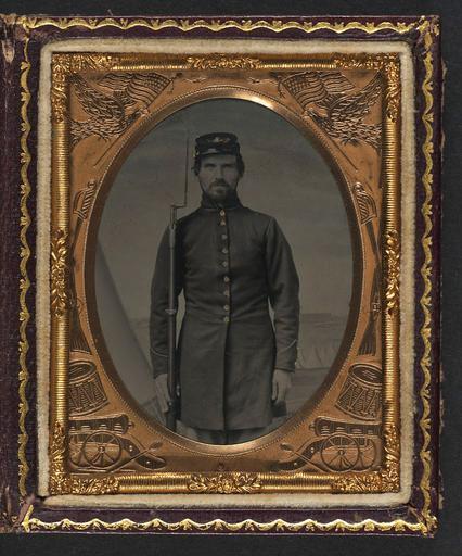 Keywords: library of congress libraryofcongress dc:identifier=http://hdl.loc.gov/loc.pnp/ppmsca.27357 dc:identifier=httphdllocgovlocpnpppmsca27357 xmlns:dc=http://purl.org/dc/elements/1.1/ xmlns:dc=httppurlorgdcelements11 u.s. civil war uscivilwar american civil war americancivilwar the civil war thecivilwar civil war civilwar war between the states warbetweenthestates united states of america unitedstatesofamerica u.s.a. usa the union theunion union the north thenorth yankee yankees soldier gun musket people photo border picture frame round [Unidentified soldier in Union uniform with bayoneted musket in front of painted backdrop showing military camp] [between 1861 and 1865] 1 photograph : ninth-plate tintype, hand-colored ; 7.5 x 6.1 cm (case) Notes: Title devised by Library staff. Case: Plain with clasp. Gift; Tom Liljenquist; 2010; (DLC/PP-2010:105). Subjects: United States.--Army--People--1860-1870. Soldiers--Union--1860-1870. Military uniforms--Union--1860-1870. Rifles--1860-1870. Bayonets--1860-1870. Backdrops--1860-1870. United States--History--Civil War, 1861-1865--Military personnel--Union. Format: Portrait photographs--1860-1870. Tintypes--Hand-colored--1860-1870. Rights Info: No known restrictions on publication. Repository: Library of Congress, Prints and Photographs Division, Washington, D.C. 20540 USA, hdl.loc.gov/loc.pnp/pp.print Part Of: Ambrotype/Tintype filing series (Library of Congress) (DLC) 2010650518 Liljenquist Family collection (Library of Congress) (DLC) 2010650519 More information about this collection is available at hdl.loc.gov/loc.pnp/pp.lilj Persistent URL: hdl.loc.gov/loc.pnp/ppmsca.27357 Call Number: AMB/TIN no. 2492 [Unidentified soldier in Union uniform with bayoneted musket in front of painted backdrop showing military camp] [between 1861 and 1865] 1 photograph : ninth-plate tintype, hand-colored ; 7.5 x 6.1 cm (case) Notes: Title devised by Library staff. Case: Plain with clasp. Gift; Tom Liljenquist; 2010; (DLC/PP-2010:105). Subjects: United States.--Army--People--1860-1870. Soldiers--Union--1860-1870. Military uniforms--Union--1860-1870. Rifles--1860-1870. Bayonets--1860-1870. Backdrops--1860-1870. United States--History--Civil War, 1861-1865--Military personnel--Union. Format: Portrait photographs--1860-1870. Tintypes--Hand-colored--1860-1870. Rights Info: No known restrictions on publication. Repository: Library of Congress, Prints and Photographs Division, Washington, D.C. 20540 USA, hdl.loc.gov/loc.pnp/pp.print Part Of: Ambrotype/Tintype filing series (Library of Congress) (DLC) 2010650518 Liljenquist Family collection (Library of Congress) (DLC) 2010650519 More information about this collection is available at hdl.loc.gov/loc.pnp/pp.lilj Persistent URL: hdl.loc.gov/loc.pnp/ppmsca.27357 Call Number: AMB/TIN no. 2492 |