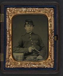 Keywords: library of congress libraryofcongress dc:identifier=http://hdl.loc.gov/loc.pnp/ppmsca.27376 dc:identifier=httphdllocgovlocpnpppmsca27376 xmlns:dc=http://purl.org/dc/elements/1.1/ xmlns:dc=httppurlorgdcelements11 picture frame people photo border indoor [Unidentified soldier in Union uniform and forage cap with pistol] [between 1861 and 1865] 1 photograph : ninth-plate ambrotype, hand-colored ; 7.6 x 6.5 cm (case) Notes: Title devised by Library staff. Case: Berg, no. 3-288. Gift; Tom Liljenquist; 2010; (DLC/PP-2010:105). Subjects: United States.--Army.--People--1860-1870. Soldiers--Union--1860-1870. Military uniforms--Union--1860-1870. Handguns--1860-1870. United States--History--Civil War, 1861-1865--Military personnel--Union. Format: Portrait photographs--1860-1870. Ambrotypes--Hand-colored--1860-1870. Rights Info: No known restrictions on publication. Repository: Library of Congress, Prints and Photographs Division, Washington, D.C. 20540 USA, hdl.loc.gov/loc.pnp/pp.print Part Of: Ambrotype/Tintype filing series (Library of Congress) (DLC) 2010650518 Liljenquist Family collection (Library of Congress) (DLC) 2010650519 More information about this collection is available at hdl.loc.gov/loc.pnp/pp.lilj Persistent URL: hdl.loc.gov/loc.pnp/ppmsca.27376 Call Number: AMB/TIN no. 2511 [Unidentified soldier in Union uniform and forage cap with pistol] [between 1861 and 1865] 1 photograph : ninth-plate ambrotype, hand-colored ; 7.6 x 6.5 cm (case) Notes: Title devised by Library staff. Case: Berg, no. 3-288. Gift; Tom Liljenquist; 2010; (DLC/PP-2010:105). Subjects: United States.--Army.--People--1860-1870. Soldiers--Union--1860-1870. Military uniforms--Union--1860-1870. Handguns--1860-1870. United States--History--Civil War, 1861-1865--Military personnel--Union. Format: Portrait photographs--1860-1870. Ambrotypes--Hand-colored--1860-1870. Rights Info: No known restrictions on publication. Repository: Library of Congress, Prints and Photographs Division, Washington, D.C. 20540 USA, hdl.loc.gov/loc.pnp/pp.print Part Of: Ambrotype/Tintype filing series (Library of Congress) (DLC) 2010650518 Liljenquist Family collection (Library of Congress) (DLC) 2010650519 More information about this collection is available at hdl.loc.gov/loc.pnp/pp.lilj Persistent URL: hdl.loc.gov/loc.pnp/ppmsca.27376 Call Number: AMB/TIN no. 2511