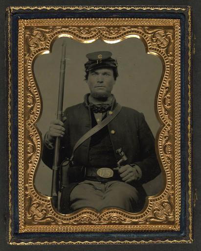 | Keywords: library of congress libraryofcongress dc:identifier=http://hdl.loc.gov/loc.pnp/ppmsca.26933 dc:identifier=httphdllocgovlocpnpppmsca26933 xmlns:dc=http://purl.org/dc/elements/1.1/ xmlns:dc=httppurlorgdcelements11 people picture frame photo border [Unidentified soldier in Union uniform with Company G 16th Regiment forage cap holding bayonet and musket] [between 1861 and 1865] 1 photograph : quarter-plate tintype, hand-colored ; 12.0 x 9.4 cm (case) Notes: Title devised by Library staff. Case: Leather gem geometric design. Gift; Tom Liljenquist; 2010; (DLC/PP-2010:105). Subjects: United States.--Army--People--1860-1870. Soldiers--Union--1860-1870. Military uniforms--Union--1860-1870. Rifles--1860-1870. Bayonets--1860-1870. United States--History--Civil War, 1861-1865--Military personnel--Union. Format: Portrait photographs--1860-1870. Tintypes--Hand-colored--1860-1870. Rights Info: No known restrictions on publication. Repository: Library of Congress, Prints and Photographs Division, Washington, D.C. 20540 USA, hdl.loc.gov/loc.pnp/pp.print Part Of: Ambrotype/Tintype filing series (Library of Congress) (DLC) 2010650518 Liljenquist Family collection (Library of Congress) (DLC) 2010650519 More information about this collection is available at hdl.loc.gov/loc.pnp/pp.lilj Persistent URL: hdl.loc.gov/loc.pnp/ppmsca.26933 Call Number: AMB/TIN no. 2081 [Unidentified soldier in Union uniform with Company G 16th Regiment forage cap holding bayonet and musket] [between 1861 and 1865] 1 photograph : quarter-plate tintype, hand-colored ; 12.0 x 9.4 cm (case) Notes: Title devised by Library staff. Case: Leather gem geometric design. Gift; Tom Liljenquist; 2010; (DLC/PP-2010:105). Subjects: United States.--Army--People--1860-1870. Soldiers--Union--1860-1870. Military uniforms--Union--1860-1870. Rifles--1860-1870. Bayonets--1860-1870. United States--History--Civil War, 1861-1865--Military personnel--Union. Format: Portrait photographs--1860-1870. Tintypes--Hand-colored--1860-1870. Rights Info: No known restrictions on publication. Repository: Library of Congress, Prints and Photographs Division, Washington, D.C. 20540 USA, hdl.loc.gov/loc.pnp/pp.print Part Of: Ambrotype/Tintype filing series (Library of Congress) (DLC) 2010650518 Liljenquist Family collection (Library of Congress) (DLC) 2010650519 More information about this collection is available at hdl.loc.gov/loc.pnp/pp.lilj Persistent URL: hdl.loc.gov/loc.pnp/ppmsca.26933 Call Number: AMB/TIN no. 2081 |