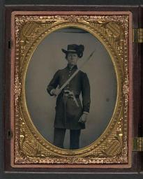 Keywords: library of congress libraryofcongress dc:identifier=http://hdl.loc.gov/loc.pnp/ppmsca.27151 dc:identifier=httphdllocgovlocpnpppmsca27151 xmlns:dc=http://purl.org/dc/elements/1.1/ xmlns:dc=httppurlorgdcelements11 u.s. civil war uscivilwar american civil war americancivilwar the civil war thecivilwar civil war civilwar war between the states warbetweenthestates confederate states of america confederatestatesofamerica c.s.a. csa the confederacy theconfederacy confederacy confederate the south thesouth rebel rebels soldier gun pistol revolver sword sabre saber people photo border round picture frame [Unidentified young soldier in Confederate uniform and Hardee hat with holstered revolver and artillery saber] [between 1861 and 1865] 1 photograph : quarter-plate tintype, hand-colored ; 12.4 x 10.0 cm (case) Notes: Title devised by Library staff. Case: Berg, no. 1-41. Gift; Tom Liljenquist; 2010; (DLC/PP-2010:105). Purchased from: Normal Civil War Antiques, Normal, Illinois, 2002. Published in: Turner, William A. Even more Confederate faces. Gaithersburg, Md.: Olde Soldier Books, Inc. 1983, p. 140. Subjects: Confederate States of America.--Army--People--1860-1870. Soldiers--Confederate--1860-1870. Military uniforms--Confederate--1860-1870. Handguns--1860-1870. Daggers & swords--1860-1870. Youth--1860-1870. United States--History--Civil War, 1861-1865--Military personnel--Confederate. Format: Portrait photographs--1860-1870. Tintypes--Hand-colored--1860-1870. Rights Info: No known restrictions on publication. Repository: Library of Congress, Prints and Photographs Division, Washington, D.C. 20540 USA, hdl.loc.gov/loc.pnp/pp.print Part Of: Ambrotype/Tintype filing series (Library of Congress) (DLC) 2010650518 Liljenquist Family collection (Library of Congress) (DLC) 2010650519 More information about this collection is available at hdl.loc.gov/loc.pnp/pp.lilj Persistent URL: hdl.loc.gov/loc.pnp/ppmsca.27151 Call Number: AMB/TIN no. 2298 [Unidentified young soldier in Confederate uniform and Hardee hat with holstered revolver and artillery saber] [between 1861 and 1865] 1 photograph : quarter-plate tintype, hand-colored ; 12.4 x 10.0 cm (case) Notes: Title devised by Library staff. Case: Berg, no. 1-41. Gift; Tom Liljenquist; 2010; (DLC/PP-2010:105). Purchased from: Normal Civil War Antiques, Normal, Illinois, 2002. Published in: Turner, William A. Even more Confederate faces. Gaithersburg, Md.: Olde Soldier Books, Inc. 1983, p. 140. Subjects: Confederate States of America.--Army--People--1860-1870. Soldiers--Confederate--1860-1870. Military uniforms--Confederate--1860-1870. Handguns--1860-1870. Daggers & swords--1860-1870. Youth--1860-1870. United States--History--Civil War, 1861-1865--Military personnel--Confederate. Format: Portrait photographs--1860-1870. Tintypes--Hand-colored--1860-1870. Rights Info: No known restrictions on publication. Repository: Library of Congress, Prints and Photographs Division, Washington, D.C. 20540 USA, hdl.loc.gov/loc.pnp/pp.print Part Of: Ambrotype/Tintype filing series (Library of Congress) (DLC) 2010650518 Liljenquist Family collection (Library of Congress) (DLC) 2010650519 More information about this collection is available at hdl.loc.gov/loc.pnp/pp.lilj Persistent URL: hdl.loc.gov/loc.pnp/ppmsca.27151 Call Number: AMB/TIN no. 2298