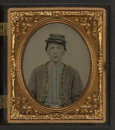 Keywords: library of congress libraryofcongress dc:identifier=http://hdl.loc.gov/loc.pnp/ppmsca.27189 dc:identifier=httphdllocgovlocpnpppmsca27189 xmlns:dc=http://purl.org/dc/elements/1.1/ xmlns:dc=httppurlorgdcelements11 u.s. civil war uscivilwar american civil war americancivilwar the civil war thecivilwar civil war civilwar war between the states warbetweenthestates united states of america unitedstatesofamerica u.s.a. usa the union theunion union the north thenorth yankee yankees soldier zouaves zouave union zouave unionzouave people picture frame photo border round indoor [Unidentified young soldier in Union Zouave uniform] [between 1861 and 1865] 1 photograph : sixth-plate tintype, hand-colored ; 9.6 x 8.4 cm (case) Notes: Title devised by Library staff. Case: Berg, no. 2-35. Gift; Tom Liljenquist; 2010; (DLC/PP-2010:105). Purchased from: Medhurst & Co., Kansas City, Kansas, 2008. Subjects: United States.--Army--People--1860-1870. Soldiers--Union--1860-1870. Military uniforms--Union--1860-1870. Zouaves--1860-1870. United States--History--Civil War, 1861-1865--Military personnel--Union. Format: Portrait photographs--1860-1870. Tintypes--Hand-colored--1860-1870. Rights Info: No known restrictions on publication. Repository: Library of Congress, Prints and Photographs Division, Washington, D.C. 20540 USA, hdl.loc.gov/loc.pnp/pp.print Part Of: Ambrotype/Tintype filing series (Library of Congress) (DLC) 2010650518 Liljenquist Family collection (Library of Congress) (DLC) 2010650519 More information about this collection is available at hdl.loc.gov/loc.pnp/pp.lilj Persistent URL: hdl.loc.gov/loc.pnp/ppmsca.27189 Call Number: AMB/TIN no. 2336 [Unidentified young soldier in Union Zouave uniform] [between 1861 and 1865] 1 photograph : sixth-plate tintype, hand-colored ; 9.6 x 8.4 cm (case) Notes: Title devised by Library staff. Case: Berg, no. 2-35. Gift; Tom Liljenquist; 2010; (DLC/PP-2010:105). Purchased from: Medhurst & Co., Kansas City, Kansas, 2008. Subjects: United States.--Army--People--1860-1870. Soldiers--Union--1860-1870. Military uniforms--Union--1860-1870. Zouaves--1860-1870. United States--History--Civil War, 1861-1865--Military personnel--Union. Format: Portrait photographs--1860-1870. Tintypes--Hand-colored--1860-1870. Rights Info: No known restrictions on publication. Repository: Library of Congress, Prints and Photographs Division, Washington, D.C. 20540 USA, hdl.loc.gov/loc.pnp/pp.print Part Of: Ambrotype/Tintype filing series (Library of Congress) (DLC) 2010650518 Liljenquist Family collection (Library of Congress) (DLC) 2010650519 More information about this collection is available at hdl.loc.gov/loc.pnp/pp.lilj Persistent URL: hdl.loc.gov/loc.pnp/ppmsca.27189 Call Number: AMB/TIN no. 2336 |