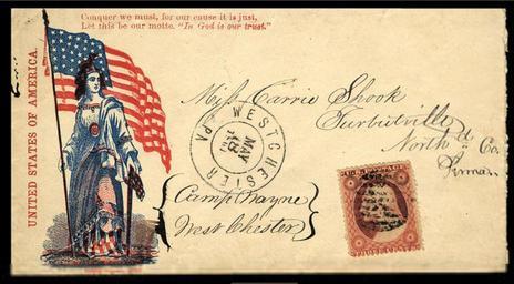 | Keywords: Union Patriotic 1861.jpg en Union patriotic cover with allegory of standing liberty and flag with In God is our trust motto used from West Chester PA Scott 26 cancelled with 7 bar circular grid not tied to cover May 18 1861 US/Union Post Office<br/>http //arago si edu/index asp con 1 cmd 1 mode 1 tid 2027691 Smithsonian National Postal Museum Patriotic Covers<br/>Photo image obtained/rendered by Gwillhickers US/Union Post Office 1861-05-18 PD-USGov Stamps of the United States 1860-1869 Postal history of the American Civil War |