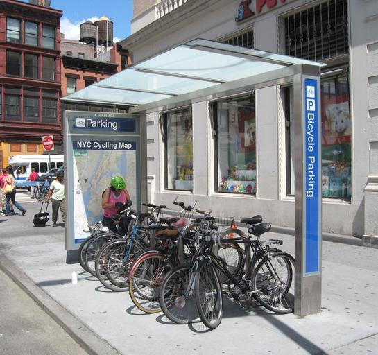MAKE A MEME View Large Image Union Sq bike parking jeh.JPG en Looking northwest towards Broadway at bike parking structure on north side of East 17th Street Manhattan on a sunny midday Own Jim henderson 2008-08-09 40 44 13 1 N 73 59 23 8 W heading NNW Union Square ...