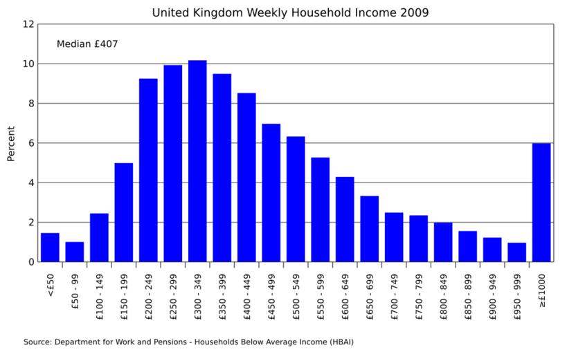 Keywords: United Kingdom household income-2009.svg translate yes en Weekly household income distribution for the United Kingdom in 2009 Before Household Costs BHC Source National Statistics http //webarchive nationalarchives gov uk/20111115132844/http //statistics dwp gov uk/asd/hbai/hbai_2009/index php page chapters Households Below Average Income HBAI Chart 2 1 2016-07-06 own Delphi234 other versions cc-zero Income distribution in the United Kingdom 2009 in the United Kingdom |