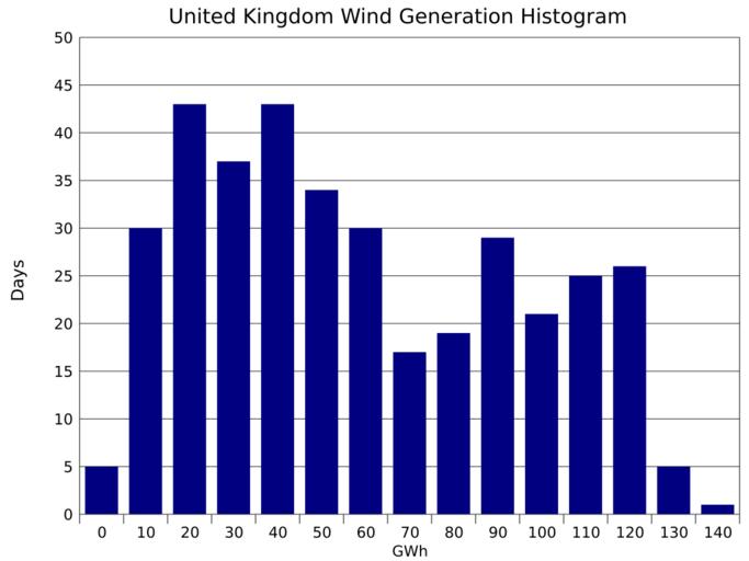 Keywords: United Kingdom Wind Generation Histogram-2015.svg translate yes en Histogram showing the number of days that a given amount of wind energy was generated in the United Kingdom in 2015 Five days produced less than 10 GWh ranging from 3 85 GWh to 8 04 GWh and on one day 141 0 GWh was produced The average per day for the year was 64 GWh Source http //www ref org uk/fuel/index php valdate 2015 tab dpy REF 2016-05-06 own Delphi234 other versions cc-zero Wind power in the United Kingdom Histograms |