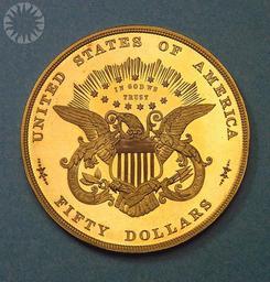Keywords: legendary coins legendarycoins numismatics money smithsonian probably public domain probablypublicdomain round circle indoor SI Neg. 2005-27355. Date: 9/1/2005...Some twenty years after the private sector had abandoned the idea of a fifty-dollar gold piece in the mid-1850s, the Philadelphia Mint considered the possibility of a federal coin of this denomination. There was even talk of a "Union", or hundred-dollar coin, and a drawing or two has survived to suggest what the Mint had in mind. But in the end, no such coin was ever produced. .The project went a bit farther in the case of the "Half Union." Dies were prepared, the work of William Barber (father of the eventual Mint Chief Engraver Charles E. Barber). .Barber's obverse and reverse designs look vaguely akin to Longacre's work for the double eagle. A few patterns were struck in copper and two in gold; the latter share a reverse die but each has a slightly different obverse die. The project was abandoned soon afterwards, as it became apparent that the new coin simply wasn't needed..Click here to view the reverse...Credit: Tom Mulvaney (Smithsonian Institution) SI Neg. 2005-27355. Date: 9/1/2005...Some twenty years after the private sector had abandoned the idea of a fifty-dollar gold piece in the mid-1850s, the Philadelphia Mint considered the possibility of a federal coin of this denomination. There was even talk of a "Union", or hundred-dollar coin, and a drawing or two has survived to suggest what the Mint had in mind. But in the end, no such coin was ever produced. .The project went a bit farther in the case of the "Half Union." Dies were prepared, the work of William Barber (father of the eventual Mint Chief Engraver Charles E. Barber). .Barber's obverse and reverse designs look vaguely akin to Longacre's work for the double eagle. A few patterns were struck in copper and two in gold; the latter share a reverse die but each has a slightly different obverse die. The project was abandoned soon afterwards, as it became apparent that the new coin simply wasn't needed..Click here to view the reverse...Credit: Tom Mulvaney (Smithsonian Institution) |