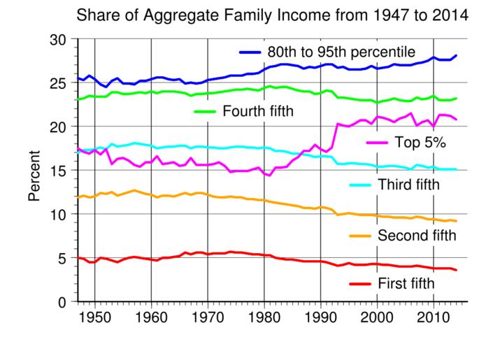 | Keywords: United States Aggregate Family Income Share.svg en Aggregate income for each fifth and top 5 percent for U S families from 1947 to 2014 Data from US Census http //www census gov/hhes/www/income/data/historical/families/ Table F 2 2016-04-19 own Delphi234 other versions current annually Generated with Wikimedia SVG Chart SVG Chart/box cc-zero Income distribution in the United States | ||||