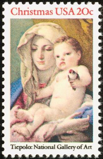 | Keywords: United States Christmas stamp 1982 Madonna of the Goldfinch, Giovanni Battista Tiepolo c. 1760.jpg en United States Christmas stamp 1982 Madonna of the Goldfinch Giovanni Battista Tiepolo c 1760 Scan of original United States Postal Service Giovanni Battista Tiepolo circa 1760 stamp 1982 Painting is out of copyright rest of stamp too simple for copyright eligibility PD-ineligible PD-Old Giovanni Battista Tiepolo 076 jpg Giovanni Battista Tiepolo - Madonna of the Goldfinch - WGA22360 jpg Stamps of the United States 1981-1990 Giovanni Battista Tiepolo 1982 stamps Carduelis carduelis on stamps Christmas on stamps Paintings on stamps Animals on stamps of the United States |