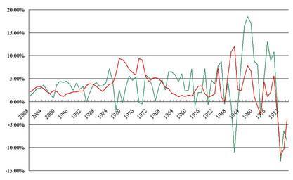 Keywords: United States GDP Inflation trend.png en Real GDP the green line and Implicit GDP deflator changes the red line in United States The original data released by Bureau of Economic Analysis on 01/30/2009 on-line available at http //www econstats com/gdp/gdp__q1 csv vi Tốc độ tăng trưởng kinh tế tỷ lệ thay đổi GDP thực tế được thể hiện bằng đư ng màu lục và tỷ lệ lạm phát tỷ lệ thay đổi chỉ số giảm phát GDP được thể hiện bằng đư ng màu đỏ ở Hoa Kỳ Biểu đồ vẽ dựa trên số liệu của Cơ quan Phân tích Kinh tế Hoa Kỳ công bố ngày 30/1/2009 tại http //www econstats com/gdp/gdp__q1 csv Own Bình Giang 2009-02-01 Bình Giang Inflation graphs Gross domestic product Economy of the United States Pictures by Binh Giang |