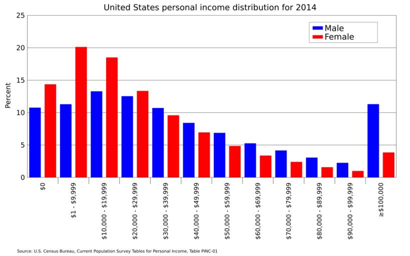 | Keywords: United States personal income by sex-2014.svg translate yes en Distribution of personal income by sex in the United States in 2014 Source U S Census Bureau Current Population Survey Selected Characteristics of People 15 Years and Over by Total Money Income Work Experience Race Hispanic Origin and Sex https //www census gov/data/tables/time-series/demo/income-poverty/cps-pinc/pinc-01 html Table PINC-01 2016-08-16 own Delphi234 other versions cc-zero Income distribution in the United States Personal income in the United States 2014 in the United States |
