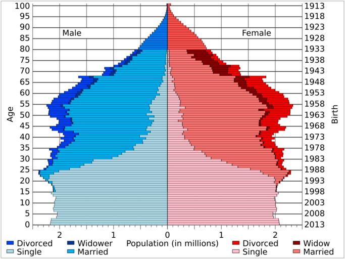 Keywords: United States Population by Age Sex and Marital Status.svg translate yes en Population of the United States by age sex and marital status demographic pyramid for 2014 Population data is from US Census Bureau http //www census gov/population/projections/files/filelayout/NP2012_D1 pdf File layouthttp //www census gov/population/projections/files/downloadables/NP2012_D1 csv Data Marital status for ages 15 to 79 from http //www census gov/cps/data/cpstablecreator html Current Population Survey 2014-10-03 own Delphi234 other versions cc-zero Uploaded with UploadWizard Population pyramids of the United States |