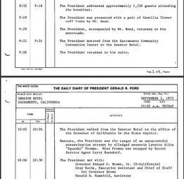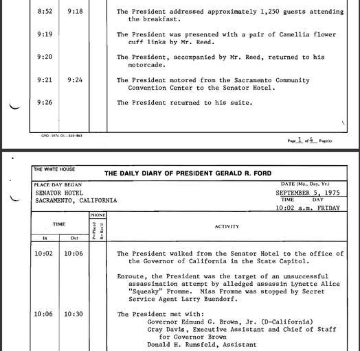 | Keywords: United States presidential daily diary, Ford, 19750905 partial.png  U S President Gerald Ford cropped September 5 1975 - 8 52 a m to 10 30 a m Location Sacramento California <br><br>The Ford assassination attempt in Sacramento was a September 5 1975 effort by cultist Charles Manson Family member Lynette Squeaky Fromme to kill U S President Gerald Ford in California Ford was in Sacramento that morning to speak at an annual California Host Breakfast The above file is pages from Ford's Daily Diary shows that Ford spoke for 26 minutes at the Host Breakfast and returned to the Senator Hotel He left the Senator Hotel at 10 02 am and walked to the California State Capitol arriving at 10 06 am Between that time the diary notes with little detail that Fromme tried to assassinate Ford Ford himself waited until the end of his meeting with the California Governor to mention that someone had jus tried to kill him The scant text in the September 5 1975 Daily Diary of President Gerald R Ford about the assassination attempt seems to reflect that nonchalant approach by the Ford administration to the assassination attempt 1975-09-05 Gerald R Ford Presidential Library Citation White House September 5 1975 Daily Diary of President Gerald R Ford September 5 1975 President's Daily Diary Collection Box 77 at the Gerald R Ford Presidential Library 12 http //www fordlibrarymuseum gov/library/document/0036/pdd750905 pdf November 27 2012 The White House PD-USGov Institution Institution Gerald R Ford Presidential Museum Gerald R Ford Presidential Library and Museum-cooperation PD-USGov 1975 works in the United States Ford assassination attempt in Sacramento Diary Scanned English texts United States presidential daily diary Ford 1975-09 Documents at the Gerald R Ford Presidential Library and Museum |