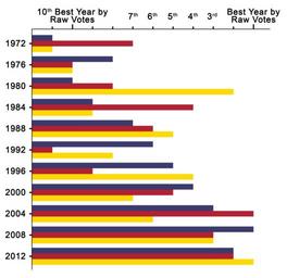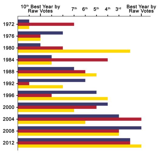 Keywords: United States presidential ordinal interyear intraparty results comparison of raw popular votes bar graph.png Key FFD900 Libertarian Party 1px AAAAAA solid 3C3B6E Democratic Party 1px AAAAAA solid B22234 Republican Party 1px AAAAAA solid Note This graph ordinally charts in terms of raw popular votes the various prominent United States of America national parties' various presidential runs since 1972 in relation to one another as opposed to charting their various presidential runs in relation to the other United States of America national parties' various presidential runs For example using this graph one can see that the Libertarian Party had its highest raw popular vote count in 2012 and its fourth-highest raw popular vote count in 1996 or that the Democratic Party had its eighth-highest raw popular vote count since 1972 in 1976 or that the Republican Party had its eleventh-highest raw popular vote count since 1972 in 1992 alexpeak com 22 March 2016 allixpeeke 200px Expanded bar graph Cc-zero United States presidential election statistics United States presidential election 1972 United States presidential election 1976 United States presidential election 1980 United States presidential election 1984 United States presidential election 1988 United States presidential election 1992 United States presidential election 1996 United States presidential election 2000 United States presidential election 2004 United States presidential election 2008 Libertarian Party presidential graphs United States Libertarian Party 1972 presidential campaign United States Libertarian Party 1976 presidential campaign United States Libertarian Party 1980 presidential campaign United States Libertarian Party 1984 presidential campaign United States Libertarian Party 1988 presidential campaign United States Libertarian Party 1992 presidential campaign United States Libertarian Party 1996 presidential campaign United States Libertarian Party 2000 presidential campaign United States Libertarian Party 2004 presidential campaign United States Libertarian Party 2008 presidential campaign United States Libertarian Party 2012 presidential campaign United States Democratic Party presidential graphs United States United States Democratic Party 1972 presidential campaign United States Democratic Party 1976 presidential campaign United States Democratic Party 1980 presidential campaign United States Democratic Party 1984 presidential campaign United States Democratic Party 1988 presidential campaign United States Democratic Party 1992 presidential campaign United States Democratic Party 1996 presidential campaign Al Gore presidential campaign 2000 United States Democratic Party 2004 presidential campaign United States Democratic Party 2008 presidential campaign United States Democratic Party 2012 presidential campaign Republican Party presidential graphs United States United States Republican Party 1972 presidential campaign United States Republican Party 1976 presidential campaign United States Republican Party 1980 presidential campaign United States Republican Party 1984 presidential campaign United States Republican Party 1988 presidential campaign United States Republican Party 1992 presidential campaign United States Republican Party 1996 presidential campaign George W Bush presidential campaign 2000 George W Bush presidential campaign 2004 United States Republican Party 2008 presidential campaign United States Republican Party 2012 presidential campaign Political bar charts Charts in English Electoral timelines of the United States of America Gary Johnson graphs |