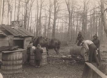 Keywords: barrels horses children maple syrup industry maplesyrupindustry monochrome outdoor Photographer: Reuben R. Sallows (1855 - 1937) Description: Two boys observe two women and a man unloading sap from a wooden barrel on a horse-drawn sledge; women dressed in black and wearing black bonnets; man in foreground on right wears hat, striped shirt, pants and suspenders; large wooden barrels and sugaring shack on left; boys in foreground to left of centre, one with back to photographer and other glancing directly at photographer; title and date (1907/23) in pencil and Sallows stamp in green ink on back Object ID : 0366-rrs-ogohc-ph View additional photographs by Sallows that are held in other collections at the Reuben R. Sallows Digital Library. Order a higher-quality version of this item by contacting the Huron County Museum (fee applies). Photographer: Reuben R. Sallows (1855 - 1937) Description: Two boys observe two women and a man unloading sap from a wooden barrel on a horse-drawn sledge; women dressed in black and wearing black bonnets; man in foreground on right wears hat, striped shirt, pants and suspenders; large wooden barrels and sugaring shack on left; boys in foreground to left of centre, one with back to photographer and other glancing directly at photographer; title and date (1907/23) in pencil and Sallows stamp in green ink on back Object ID : 0366-rrs-ogohc-ph View additional photographs by Sallows that are held in other collections at the Reuben R. Sallows Digital Library. Order a higher-quality version of this item by contacting the Huron County Museum (fee applies). |