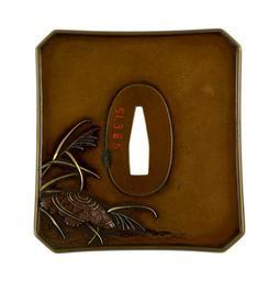 Keywords: Unno Moritoshi - Tsuba Referring to the Noh Play "Kayoi Komachi" - Walters 51385 - Back.jpg At the lower right of the tsuba a dog sits among reeds with a skull and a skeleton A full moon breaks through clouds at the upper right This scene is a traditional reference to the noh play Kayoi Komachi The Nightly Courting of Komachi Ono no Komachi was a 9th-century poet In the play her spirit and the spirit of her suitor Fukakusa no Shôshô appear to a priest The priest deduces that one of the ghosts is Ono no Komachi because the ghost makes a reference to her poem about pampas grass growing through a skull On the back the straw hat at the lower left is an allusion to a legend about Ariwara no Narihira finding Komachi's skull while he was traveling 1866 Edo copper gold silver cm 8 4 accession number 51 385 14749 Henry Walters Baltimore date and mode of acquisition unknown Walters Art Museum Henry Walters Acquired by Henry Walters Date Keio ni hi-no-e tora nanro/Unno Moritoshi kore o kizamu; Signature Keio ni hi-no-e tora nanro/Unno Moritoshi kore o kizamu; Translation Eighth month in the second year of Keio 1866 the year of the Tiger/This was engraved by Unno Moritoshi place of origin Mito Japan Walters Art Museum license Tosogu Japanese sword fittings in the Walters Art Museum Unno Moritoshi Media contributed by the Walters Art Museum needs category review |