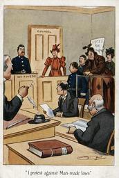 | Keywords: the women's library thewomenslibrary hires c.1910TWL.2000.151Postcard, printed, cardboard, polychrome, white border, black text, anti-suffrage cartoon depicting a suffragette being prosecuted in court, policeman in the witness box, group of suffragettes in the viewing gallery, one holding a poster reading 'Votes for Women', printed inscription front: 'I protest against Man-made laws', manuscript inscription reverse, can not be distinguished. c.1910TWL.2000.151Postcard, printed, cardboard, polychrome, white border, black text, anti-suffrage cartoon depicting a suffragette being prosecuted in court, policeman in the witness box, group of suffragettes in the viewing gallery, one holding a poster reading 'Votes for Women', printed inscription front: 'I protest against Man-made laws', manuscript inscription reverse, can not be distinguished. |