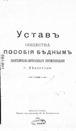 | Keywords: UOPBELVB-01.jpg УСТАВЪ ОБЩЕСТВА ПОСОБІЯ БѢД Ы Ъ ЕВА ГЕЛИЧЕСКО-ЛЮТЕРА СКАГО ВѢРОИСПОВѢДА ІЯ БѢЛОСТОК 1902 - 1st page archive of http //www ksiaznicapodlaska pl/ Książnica Podlaska im Łukasza Górnickiego archive of evangelical-lutheran parish in Białystok POLAND; scanned by Krzysztof Maria Różański Upior polnocy Images by Upior polnocy 1902 ОБЩЕСТВО ПОСОБІЯ БѢД Ы Ъ ЕВА ГЕЛИЧЕСКО-ЛЮТЕРА СКАГО ВѢРОИСПОВѢДА ІЯ БѢЛОСТОК We would be very grateful for notifying User Upior_polnocy or the Parish about futher using esp in research but it is not mandatory as it is PD PD-RusEmpire Уставъ общества пособія бѣднымъ евангелическо-люте анскаго вѣ оисповѣданія Бѣлосток 1902 |