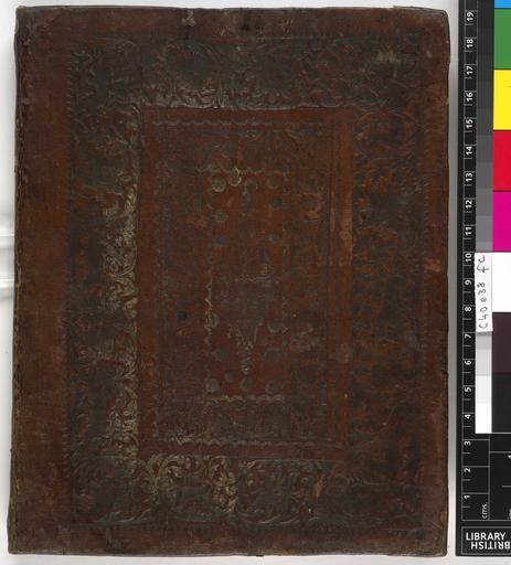 Keywords: - Upper cover (c40e38).jpg Style Panel design; Caption Upper cover; Colour Brown; Edge Unspecified exhibition history Decorative Technique Tooled in blind Tooled in gold Tooled in silver; Cover Material Sheep May be Slavonic May be tooled in silver or gold object history Text 1741; Unspecified; Unspecified object type Cc-zero place of creation Binding Slavonic place of discovery Unspecified British Library image http //www bl uk/catalogues/bookbindings/LargeImage aspx RecordId 020-000010106 ImageId ImageId 44658 Copyright BL Unspecified Uploaded with GWToolset - Upper cover c40e38 http //www webarchive org uk/bldatasets/bindings/11014_4 jpg Bookbinding 18th-century bookbinding British Library Bookbindings |