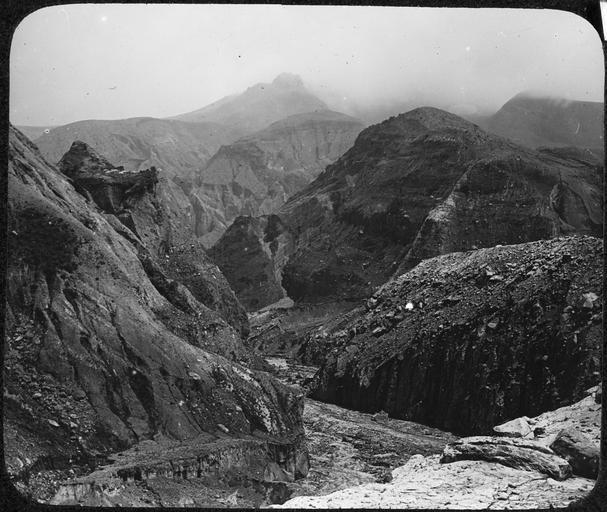 Keywords: Upper part Riviere Blanche or Claire Pelee V-shaped notch YORYM-TA0317.jpg One slide and two negatives Steep-sided v-shaped river valley The course of the stream is in a flat floored gorge set in the bottom of the valley Remnants of terraces on the valley sides probably represent the top of the ash deposited in the valley in 1902 The v-shaped notch in the background and partly obscured by cloud was the point from which nuees ardentes issued in 1902 depicted people depicted place Rivière Blanche Martinique 1907 Black and White glass Lantern slide Institution Yorkshire Museum Natural History object history exhibition history credit line Yorkshire Museum York Museums Trust accession number YORYM TA317 The Tempest Anderson Photographic Archive held at York Museums Trust <br> York Museums Trust image PD-old-100 PD-US Uploaded with UploadWizard Images from the Tempest Anderson Collection vulcanology 1902 eruption of Mount Pelée 1907 photographs |