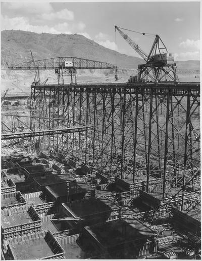 | Keywords: "Upstream placing trestle on the west side showing cranes handling concrete blocks below." - NARA - 294306.tif Scope and content Photograph from Volume Two of a series of photo albums documenting the construction of the Grand Coulee Dam and related work on the Columbia Basin Project General notes 294306 Local identifier Department of the Interior Bureau of Reclamation Engineering and Research Center 05/18/1981 - 03/04/1988 NARA's Rocky Mountain Region Denver NRGA Building 48 Denver Federal Center West 6th Avenue and Kipling Street Denver CO 80225-0307 1936-03-25 Record group Record Group 115 Records of the Bureau of Reclamation 1889 - 2008 Record group ARC 444 Photograph albums compiled 1903 - 1972 Series ARC 293611 File unit File unit ARC Variant control numbers NAIL Control Number NRG-115-CONSTPHO85006-COLBASIN21034 yes Other versions <gallery> File Upstream_placing_trestle_on_the_west_side_showing_cranes_handling_concrete_blocks_below _-_NARA_-_294306 tif tif File Upstream_placing_trestle_on_the_west_side_showing_cranes_handling_concrete_blocks_below _-_NARA_-_294306 jpg jpg </gallery> NARA-cooperation PD-USGov Construction of the Grand Coulee Dam NARA TIF images with categorized JPGs |