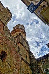Keywords: upwards view sky buildings rock look