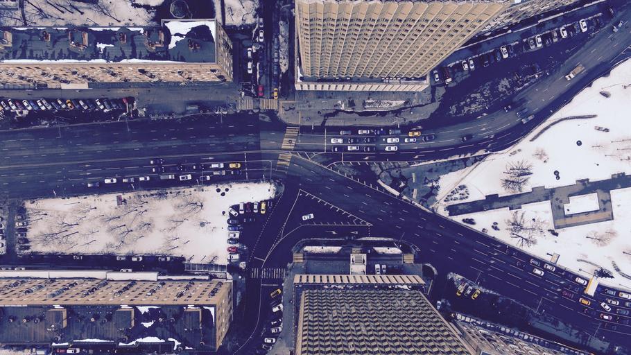 Keywords: urban city aerial view buildings snow city urban cityscape aerial architecture skyscraper road traffic metropolitan town intersection metropolis district high top street