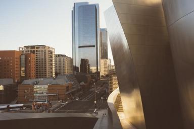 Keywords: urban modern architecture city facade buildings design streets roads buses cars pedestriations sidewalk sunset