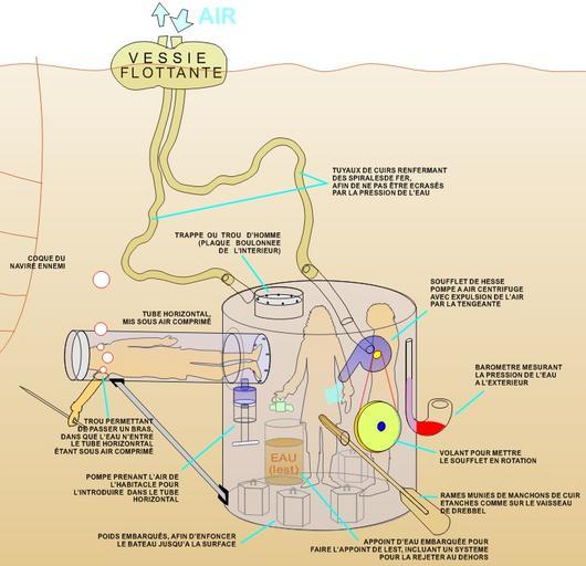 Keywords: Urinator shéma.jpg fr Deuxième modèle de sous-marin de Papin 1692 Shéma inspiré d'un dessin de Denis Papin D Papin 2005 PD-Art Unidentified diagrams Diagrams in French Underwater diving equipment