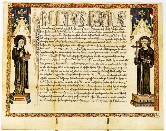 Keywords: Urkunde klarissen nuernberg.jpg Urkunde des Nürnberger Klarenklosters für den Reichsforstmeister Konrad Waldstromer vom 28 August 1362 - Nürnberg Staatsarchiv Urkunden Nr 1118 Krone und Schleier Kunst aus mittelalterlichen Frauenklöstern Ausst Kat unter Beteiligung von Jutta Frings Jan Gerchow Essen Ruhrlandmuseum Die frühen Klöster und Stifte 500-1200 Bonn Kunst- und Ausstellungshalle der Bundesrepublik Deutschland Die Zeit der Orden 1200-1500 19 März - 3 Juli 2005 München Hirmer 2005 S 515 Kat 460 1362 PD-old-100 Illuminated archival materials History of Nuremberg Stromer Adelsgeschlecht 1362 documents 1362 in art |