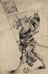 Keywords: Urs Graf Juliusbanner Zug.jpg en The bearer of the 'Julius' banner of the canton Zug; man wearing an elaborate costume striding to l his mouth open l arm raised and r hand carrying a banner depicting in the top l corner the Passion scene Descent from the Cross he is wearing a crown of foliage and carrying a sword and dagger a feathered hat hangs down by his legs 1521 Pen and black ink British Museum Inv No 1912 0709 1 Creator Urs Graf 1521 Urs Graf Juliusbanner Landsknechts PD-old-100 |