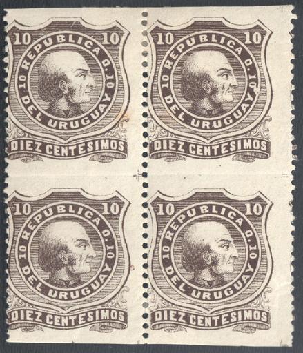 Keywords: Uruguay 1883 Sc51 B4 HI.jpg en Uruguay 1883 Sc51 unused block of four lacking horizontal perforation Catalogue Sc 51 1883 own scan Uruguay post See more images Uruguay 1883 Sc51 jpg Uruguay 1883 bisect jpg Uruguay 1883 Sc51 B4 jpg Uruguay 1883 Sc51 B4 HI jpg Uruguay 1883 Sc51 B4 MP jpg Uruguay 1883 Sc51a B4 jpg LangSwitch Uruguay 10 centesimos brown issue 1883 Scott 51 Depicting José Gervasio Artigas Custom license marker 2016 04 16 PD-Uruguay PD-old-100 Stamps of Uruguay 1883 Stamp perforation errors Uncatalogued stamp oddities and errors ImageNote 1 1936 632 192 178 2409 2811 2 White dot plate error ImageNoteEnd 1 |