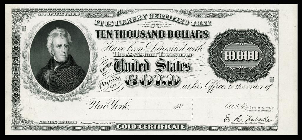 Keywords: US-$10000-GC-1888-Fr-1224a (PROOF).jpg Bureau of Engraving and Printing proof of a 10 000 Gold certificate Series of 1888 Fr Ref 1224a depicting Andrew Jackson Engraved signatures of Rosecrans Register of the Treasury and Nebecker Treasurer of the United States All issued notes of this variety have been redeemed 2013-12-29 12 56 09 Image by Godot13 The Bureau of Engraving and Printing Institution Smithsonian National Museum of American History Use of this image should give credit to the National Numismatic Collection at the Smithsonian Institution 2013030510011547 <noinclude> DEFAULTSORT US- 10000-GC-1888-Fr-1224a PROOF jpg </noinclude> PD-USGov self cc-by-sa-4 0 Godot13 National Numismatic Collection <br>National Museum of American History Currency 2014 User Godot13 NNC Banknotes scanned by User Godot13 NNC United States Banknotes 1861-present Uploaded with UploadWizard 10000 United States dollar banknotes |
