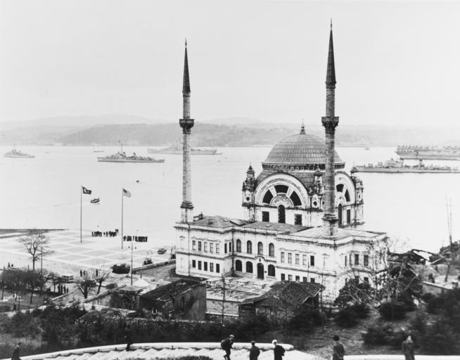 | Keywords: US 6th Fleet warships at Istanbul in March 1950.jpg Warships of the U S Navy's Sixth Fleet anchored off the city of Istanbul Turkey during a good will visit 2 March 1950 Note the U S Navy personnel on the landing in left center with United States and Turkish flags flying nearby Ships present are from left to right the destroyer USS Glennon DD-840 ; USS Charles R Ware DD-865 ; the heavy cruiser USS Newport News CA-148 ; USS Everett F Larson DDR-830 ; and the aircraft carrier USS Midway CVB-41 Midway with assigned Carrier Air Group 4 CVG-4 was deployed to the Mediterranean Sea from 6 January to 23 May 1950 <br> The Dolmabahçe Mosque is visible in the foreground Official U S Navy photo http //www history navy mil/our-collections/photography/numerical-list-of-images/nara-series/80-g/80-G-410000/80-G-413452 html 80-G-413452 from the U S Navy http //www history navy mil Naval History and Heritage Command 1950-03-02 U S Navy PD-USGov-Military-Navy USS Midway CV-41 USS Newport News CA-148 USS Everett F Larson DD-830 USS Glennon DD-840 USS Charles R Ware DD-865 United States Sixth Fleet Istanbul in the 1950s Exterior of the Dolmabahçe Mosque |