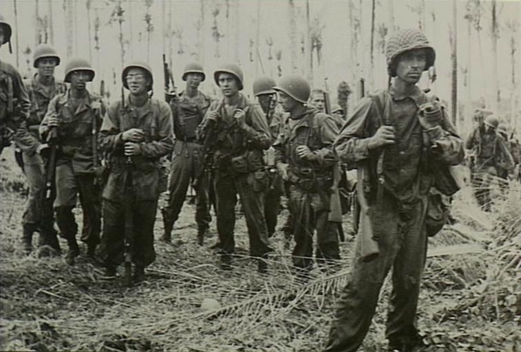 | Keywords: US Army soldiers after returning from a patrol near Arawe, December 1943.jpg United States Army soldiers at Arawe returning from a patrol into territory which had recently been captured from the Japanese 016317 1943-12 Harold George Dick PD-Australia Battle of Arawe Black and white photographs |