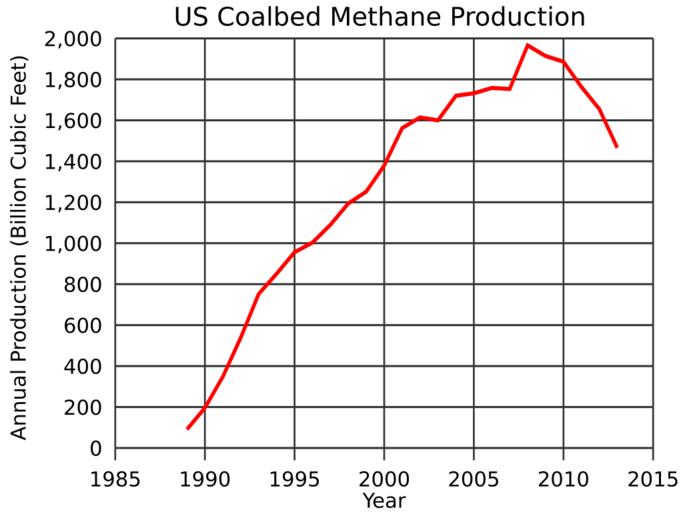 Keywords: US Coalbed Methane Production.svg translate yes en United States coalbed methane production from 1989 to 2013 Data from http //www eia gov/dnav/ng/ng_prod_coalbed_s1_a htm EIA gaz de couche aux États-Unis ; augmentation régulière de 1990 à 2008 et déclin de 2008 à 2013 2014-12-18 own Delphi234 other versions cc-zero Uploaded with UploadWizard Coalbed methane |