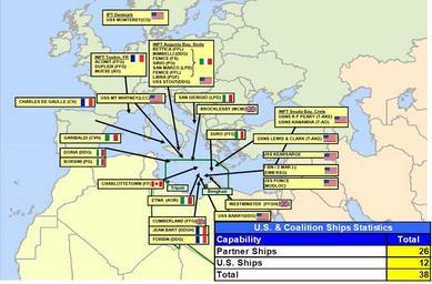| Keywords: US and Coalition Maritime Forces Libya 2011.jpg Operation Odyssey Dawn in Libya 2011 U S and Coalition Maritime Forces Laydown US Vice Admiral Bill Gortney Director of The Joint Staff You can see here a quick view of the maritime laydown with most ships operating just to the north of Libya These are of course notional positions as the ships are moving about but it gives you a sense of the size and scope of the naval effort being expended by the -- by the coalition Twenty-six of these ships are being contributed by partner nations today up from 22 on Sunday and the United States has a total of 12 I ™d note that the presence of two aircraft carriers France ™s Charles De Gaulle and Italy ™s Garibaldi both of which have combat aircraft that embark http //www defense gov/transcripts/transcript aspx transcriptid 4798 http //www defense gov/news/d20110324pptslides pdf 2011-03-24 U S Department of Defense Office of the Assistant Secretary of Defense Public Affairs PD-USGov Operation Odyssey Dawn 2011 military intervention in Libya Maps of the 2011 Libyan civil war |