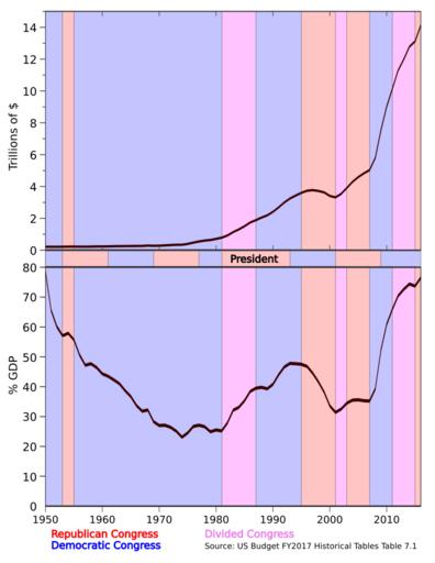 Keywords: US Debt Trend-Congress.svg en Time series of U S public debt overlaid with partisan affiliation of the Congress and the White House The upper graph shows the U S public debt in trillions of USD while the lower graph shows the U S public debt as a percentage of GDP Debt for 2016 is estimated Data is from the FY 2017 U S Budget report https //www gpo gov/fdsys/search/pagedetails action granuleId BUDGET-2017-TAB-8-1 packageId BUDGET-2017-TAB Table 7 1 2016-03-26 own Delphi234 other versions File US Debt Trend svg current annually cc-zero Economy of the United States Government debt Government of the United States United States Congress Presidents of the United States |
