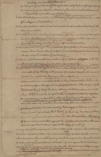 | Keywords: US Declaration of Independence draft 4.jpg US Declaration of Independence draft 4 jpg en Realizing the importance of the writing of the Declaration of Independence for the American Revolution and posterity Thomas Jefferson prepared his Notes of Proceedings in Congress June 7 “August 1 1776 He included a copy of the Declaration as it was presented to Congress on June 28 and amended by them in the days leading up to its final approval by Congress on July 4 1776 In 1781 James Madison asked Jefferson for his account of those tumultuous and pivotal days and Jefferson sent him these notes id Menyadari pentingnya penulisan Deklarasi Kemerdekaan untuk Revolusi Amerika dan generasi mendatang Thomas Jefferson mempersiapkan catatannya di Kongres 7 Juni sampai 1 Agustus 1776 Disertakan juga salinan dari Deklarasi Kemerdekaan yang dipersembahkan kepada Kongres pada 28 Juni dan diamandemen oleh mereka pada hari-hari menjelang persetujuan akhir dengan Kongres pada tanggal 4 Juli 1776 Pada 1781 James Madison meminta catatan milik Jefferson mengenai hari-hari penuh gejolak dan sangat penting dan Jefferson mengirimnya catatan ini http //myloc gov/Exhibitions/creatingtheus/DeclarationofIndependence/BattleJoined/ExhibitObjects/declarationroughdraft aspx U S Library of Congress Thomas Jefferson 1776 <gallery> File US Declaration of Independence draft 1 jpg Page 1 of the draft File US Declaration of Independence draft 2 jpg Page 2 of the draft File US Declaration of Independence draft 3 jpg Page 3 of the draft </gallery> PD-old-100 Draft of the United States Declaration of Independence |